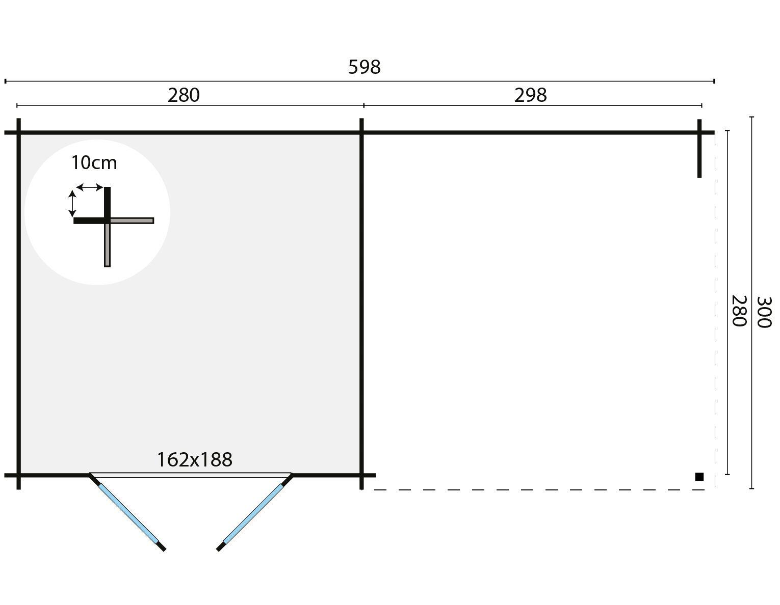 blokhut Chappo 300x300 cm heeft een strakke uitstraling en is een blikvanger in uw tuin. Met de ruime zijluifel van 298 cm kunt u bijvoorbeeld de fietsen neer te zetten of een heerlijke zitplek creëren. Met de wind- en waterdichte hoekverbindingen blijven al uw spullen veilig en droog staan.
