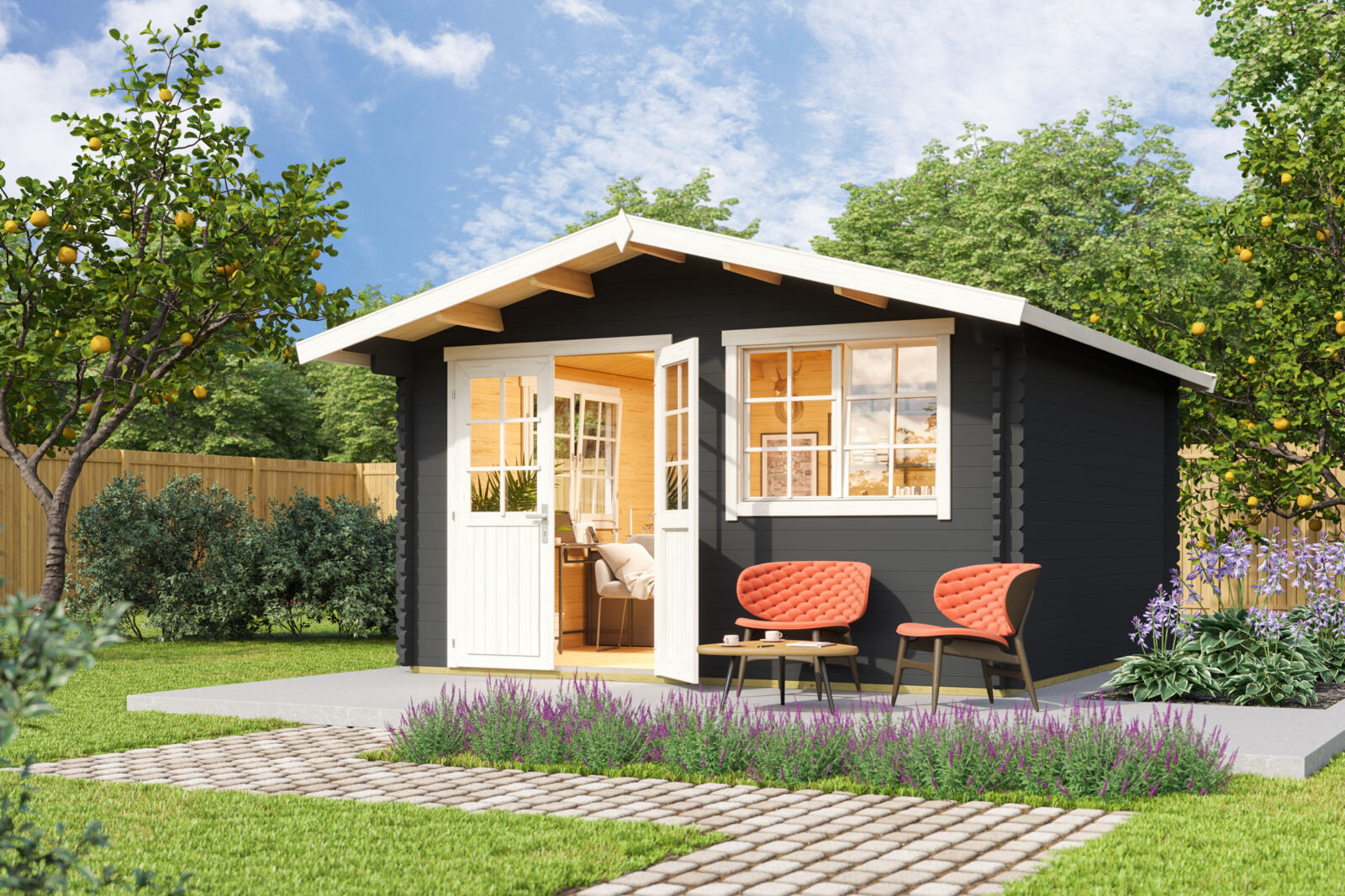 Het Tuinhuis Norderney 3 heeft een fundamentmaat van 390cm(b) x 390cm(d). De 40mm dikke vurenhouten wanddelen zijn uitgevoerd met dubbele veer en groef en een wind en waterkerende hoekverbinding. De traditionele blokhut-stapelbouw methode zorgt voor een sterke en stabiele constructie. De dubbele deur en de twee dubbele draai/tuimel ramen zijn voorzien van echt glas, de houten kruisverdeling wordt los meegeleverd waardoor u zelf de keuze heeft of u deze wilt gebruiken. De voorzijde van dit tuinhuis is extra beschermd tegen de regen door de oversteek van 70cm. Door de meegeleverde houten vloer staat het tuinhuis vrij van de ondergrond waardoor deze van binnen droog en schoon blijft. De vloerconstructie bestaat uit hogedruk geïmpregneerde onderliggers (45x45mm) en vuren vloerdelen voorzien van veer en groef (90x15mm). Het basispakket wordt geleverd inclusief montagehandleiding, onderdelenlijst, alle benodigde bevestigingsmaterialen, deur- en raambeslag en een houten windankerset. Dakbedekking is optioneel leverbaar, zoals bijvoorbeeld dakshingles die in diverse kleuren beschikbaar zijn. Het stapelbouw blokhut systeem is door de handige doe-het-zelver prima zelf te monteren en dit tuinhuis wordt als bouwpakket bij u thuis geleverd.